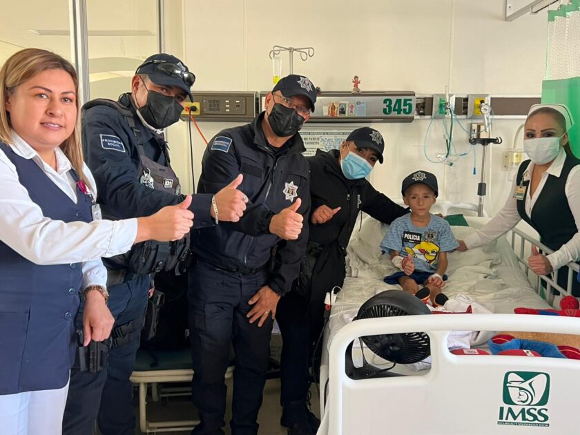 Obsequian elementos de Seguridad Pública gorra a niño en tratamiento de quimioterapia