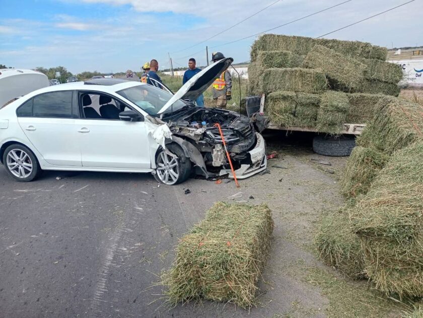 Automóvil choca con traila cargada con pacas de alfalfa en la carretera San Pedro – Torreón