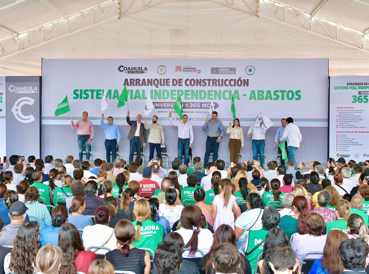 Torreón, Coahuila.- Con una inversión de 365 millones de pesos, el gobernador de Coahuila Manolo Jiménez Salinas y el alcalde Román Alberto Cepeda González dieron el banderazo de arranque de la construcción del Sistema Vial Independencia- Abastos, un proyecto integral que no sólo mejorará la circulación vehicular, sino que fortalecerá el drenaje pluvial en esta parte de la ciudad en beneficio de los y las torreonenses.