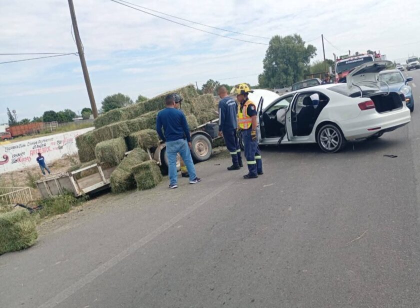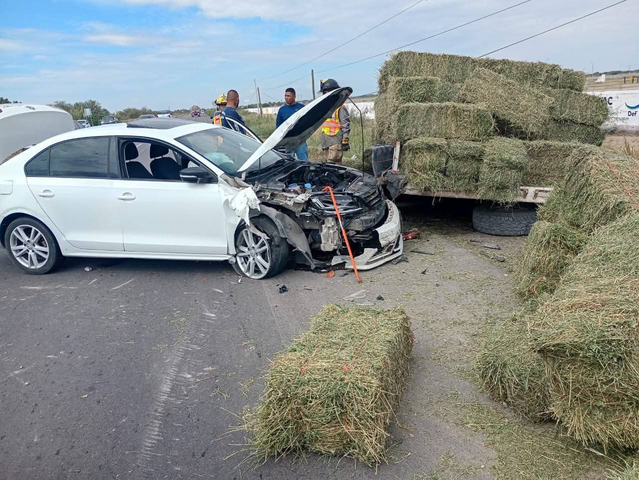 San Pedro, Coahuila.- La mañana de este jueves se registró un accidente en la carretera Torreón–San Pedro, a la altura del entronque del ejido Dolores, donde un automóvil Volkswagen Jetta, color blanco, conducido por Héctor Roque Carlos, de 24 años y originario de Torreón, se impactó contra una traila cargada con pacas de alfalfa que permanecía varada a un costado de la vía, junto con la camioneta que la remolcaba.