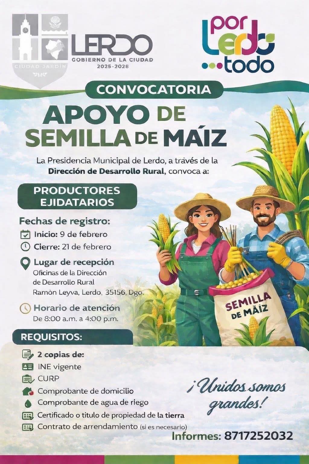 Lerdo, Durango.- La Dirección de Desarrollo Rural lanzó la convocatoria para el programa de Apoyo de Semilla de Maíz, dirigido a productores ejidatarios del área rural del municipio.