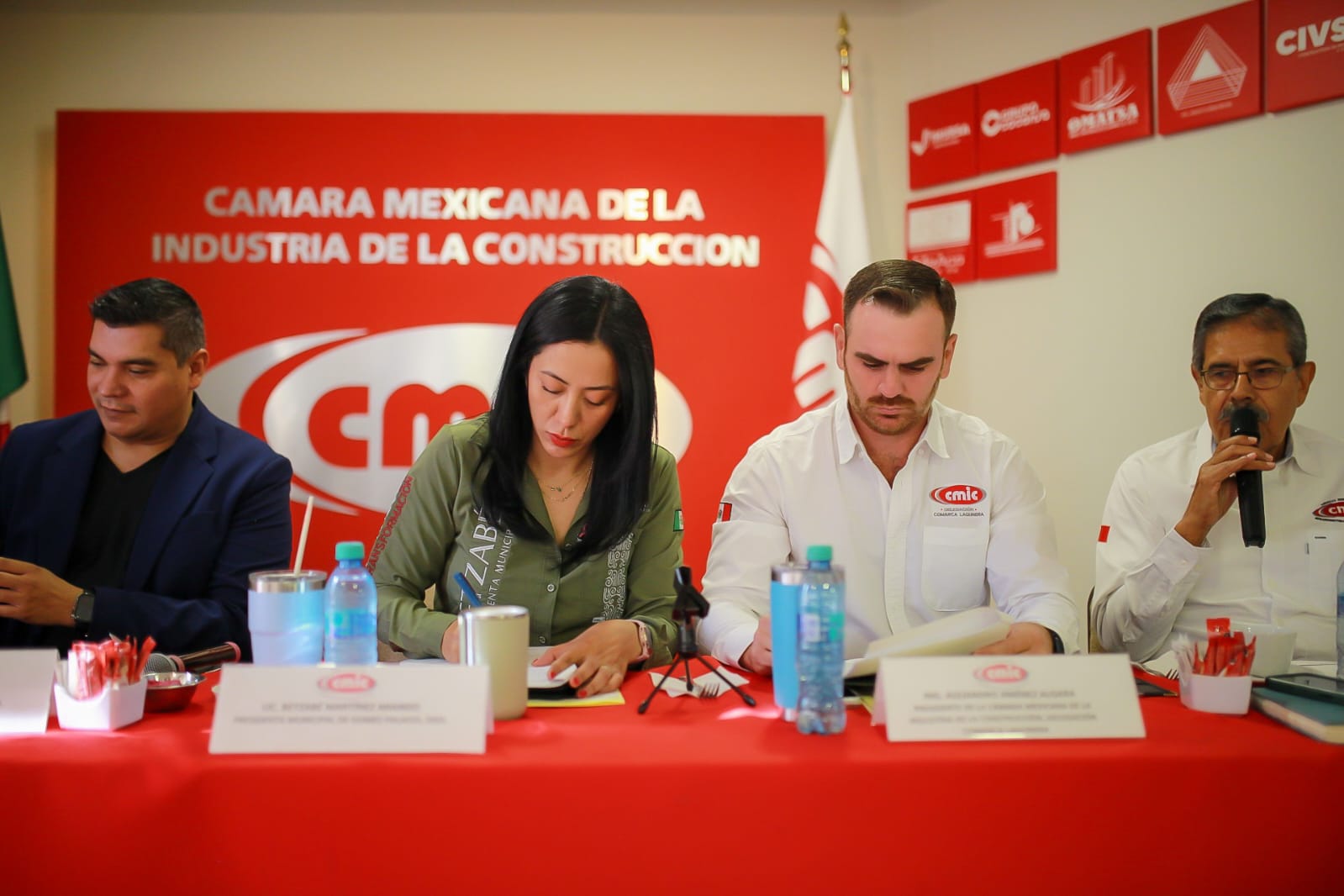 Gómez Palacio, Durango.- Ejemplo de la buena relación existente entre el gobierno municipal gomezpalatinos y los socios de la Cámara Mexicana de la Industria de la Construcción (CMIC), la alcaldesa Betzabé Martínez Arango asistió este martes a las oficinas de la delegación Laguna con el propósito de firmar el convenio de colaboración que de su Administración con los constructores locales para beneficio de los trabajadores de esta organización y del DIF Municipal.