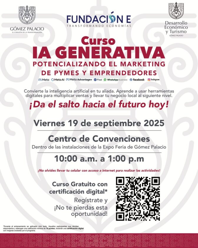 Gómez Palacio, Durango.- Con el propósito de facilitar el acceso a la inteligencia artificial, impulsar la inclusión digital y fortalecer el uso estratégico de herramientas tecnológicas para acelerar procesos de venta y consolidación en negocios locales, el Ayuntamiento de Gómez Palacio, a través de la dirección de Desarrollo Económico invita al Curso programa “IA Generativa: Potencializando el Marketing de Pymes y Emprendedores”.