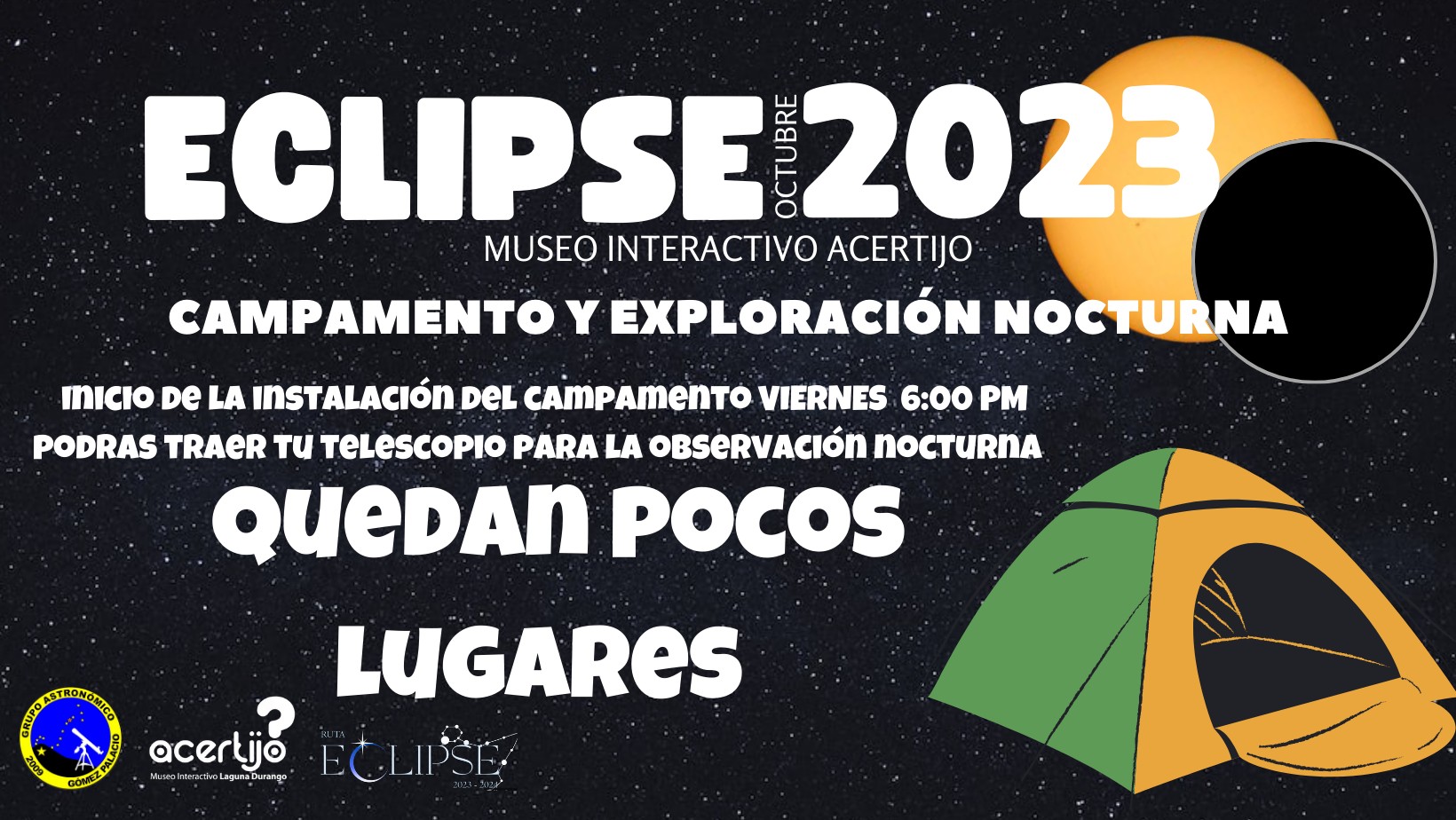Comarca Laguera.- Acertijo Museo Interactivo abre sus puertas para todos los aficionados a las ciencias y la astronomía para que se unan al “Campamento Astronómico” que se llevará a cabo el próximo viernes 13 de octubre, a partir de las 18:00hrs. en el patio del Museo, y presenciar el avistamiento del Eclipse Anular de Sol el 14 de octubre a partir de las 9:00hrs. Así lo dio a conocer el director del Acertijo, Gustavo Gutiérrez Zamudio.