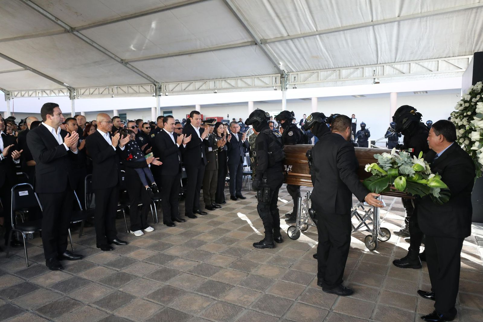 Durante la ceremonia, se realizó la colocación de una placa conmemorativa en el muro de los caídos en cumplimiento del deber, acto encabezado por el gobernador Manolo Jiménez, quien estuvo acompañado por la esposa del elemento, Nadia Pérez Obregón, y su hija.