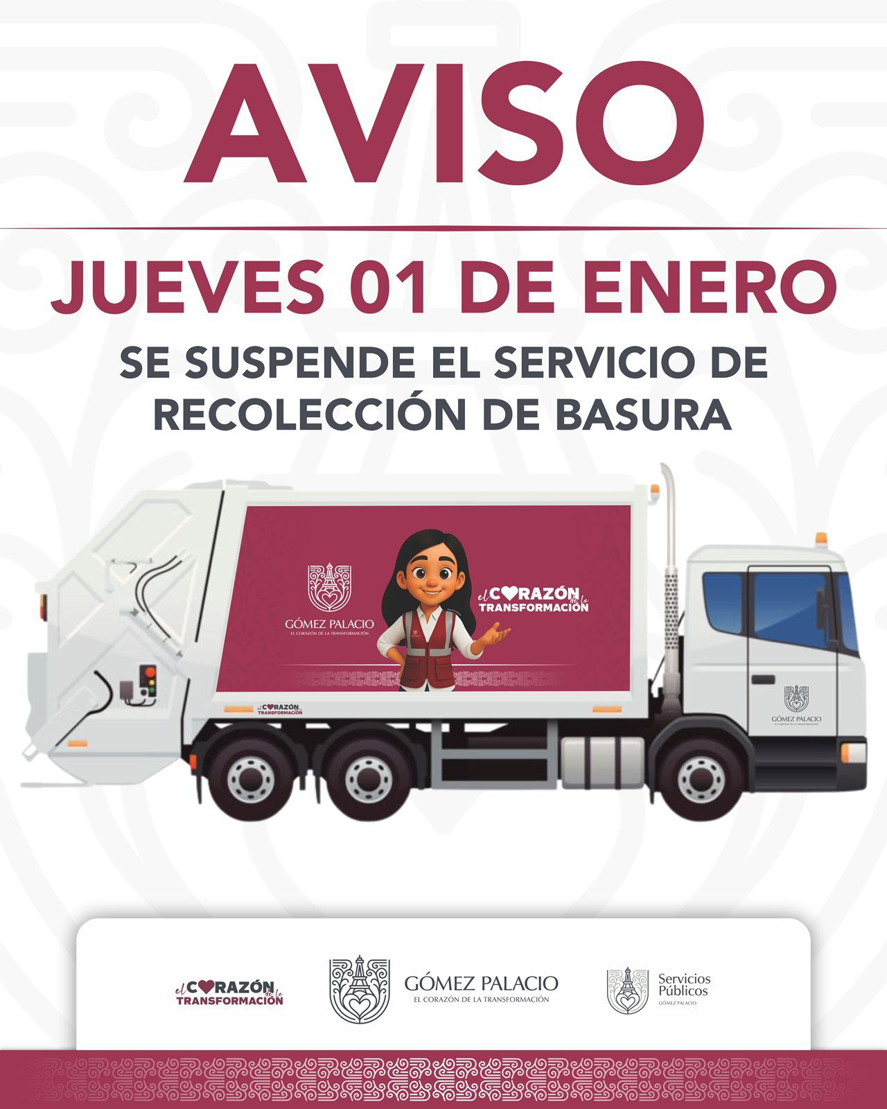 Gómez Palacio, Durango.- El Ayuntamiento de Gómez Palacio, a través de la Dirección de Servicios Públicos Municipales, informa a la ciudadanía que el jueves 1° de enero de 2026 se suspenderá de manera temporal el servicio de recolección de basura, debido a la conmemoración del Año Nuevo, considerado día inhábil para el personal operativo del área.
